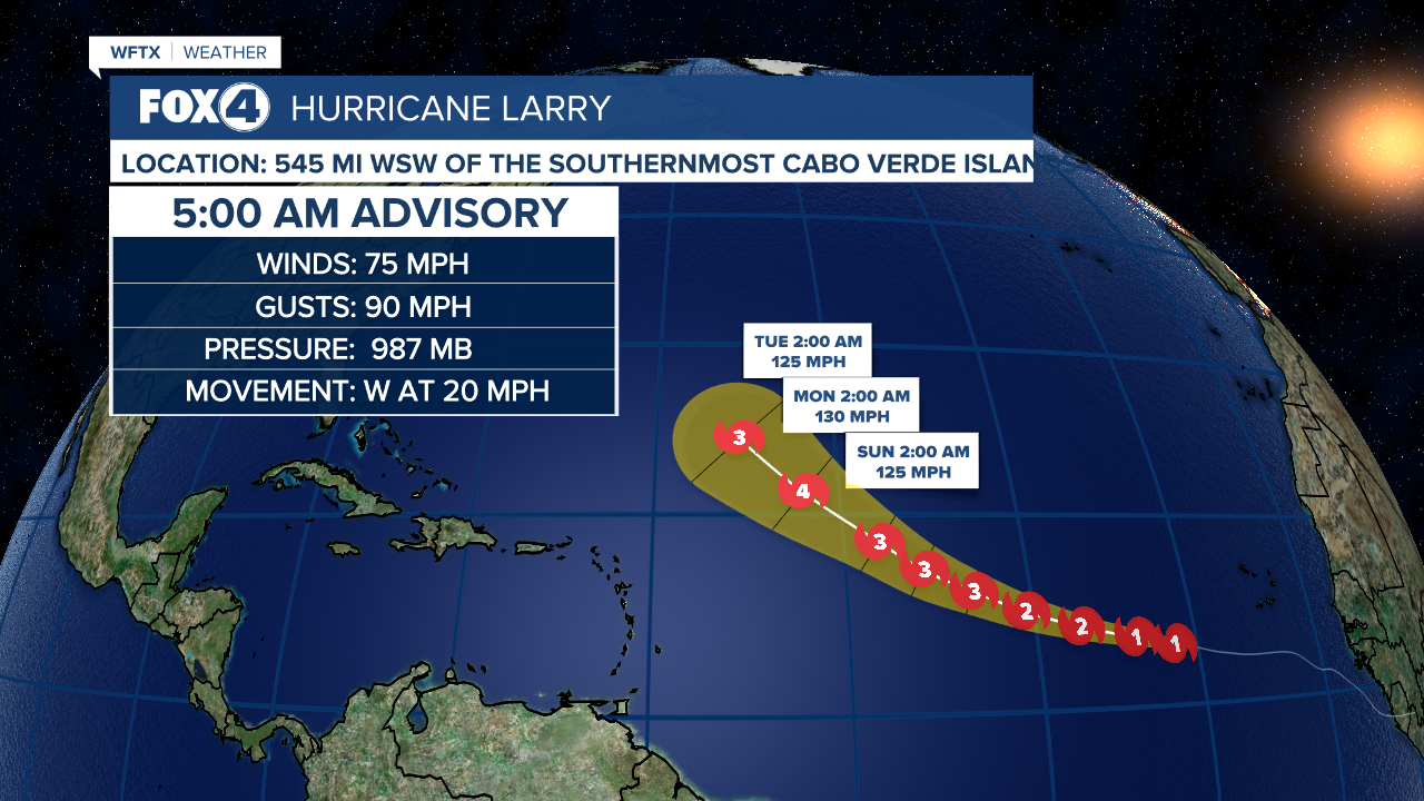 ITS MOVING WEST AT 20 MILES AN HOUR CONTINUES THAT PATH EVENTUALLY TAKING MORE OF A. It is moving towards the west. Larry is on track to become a major hurricane by the start of the weekend.